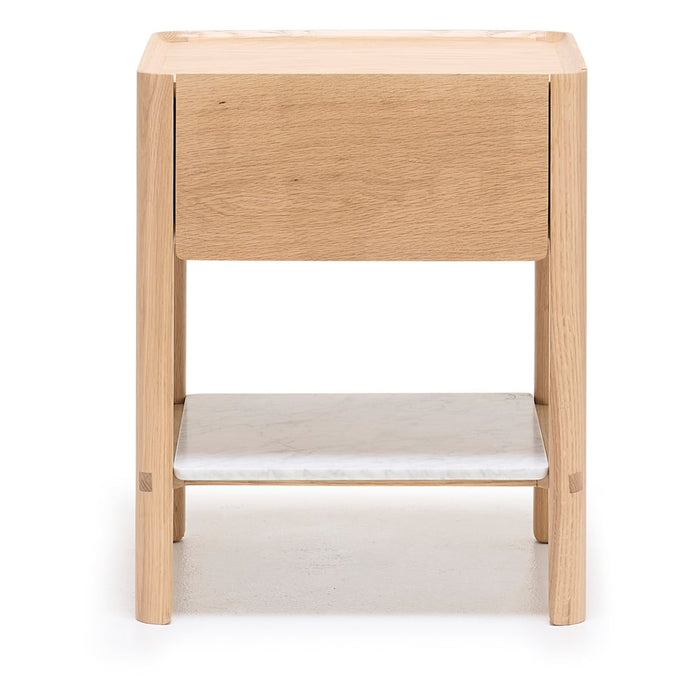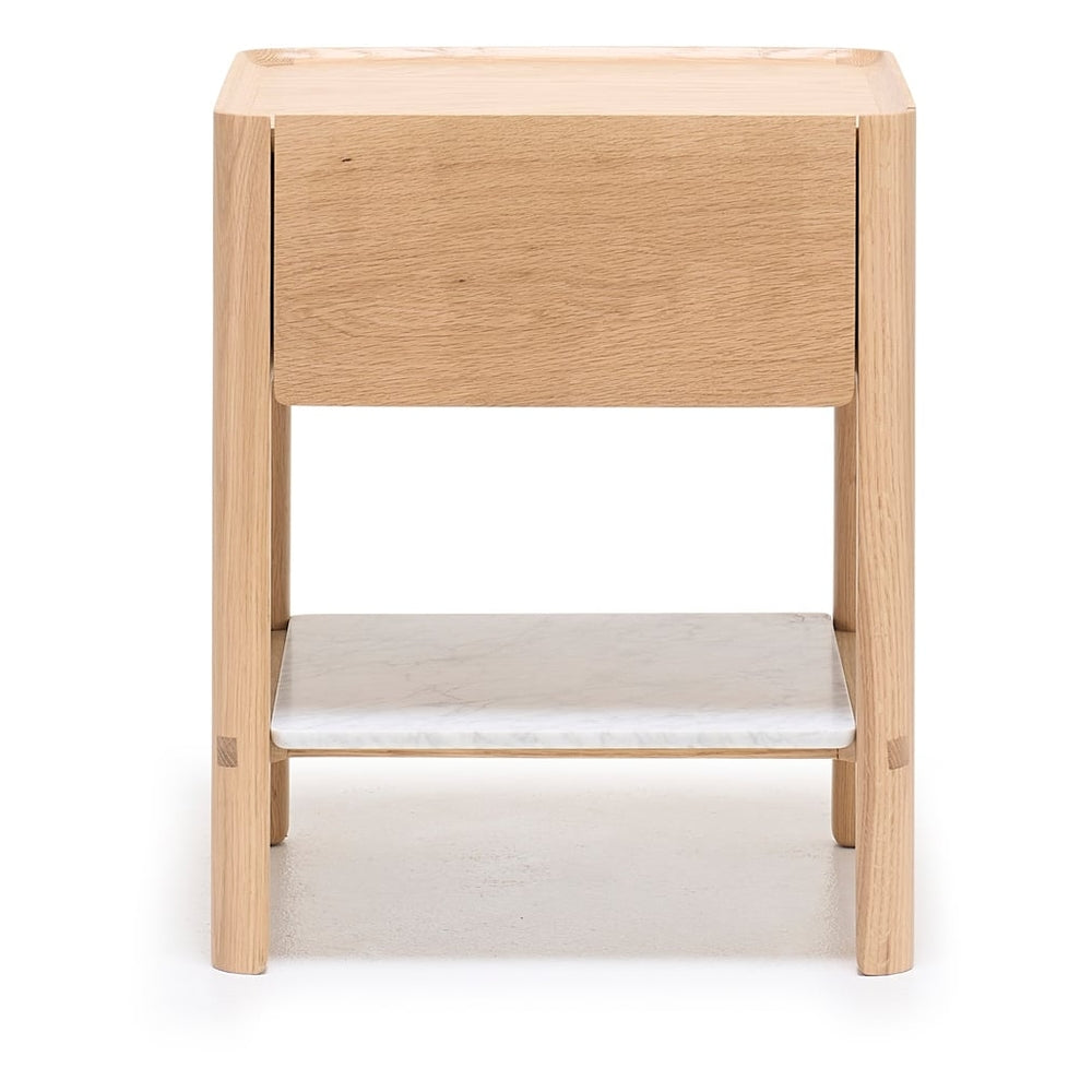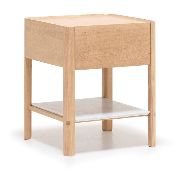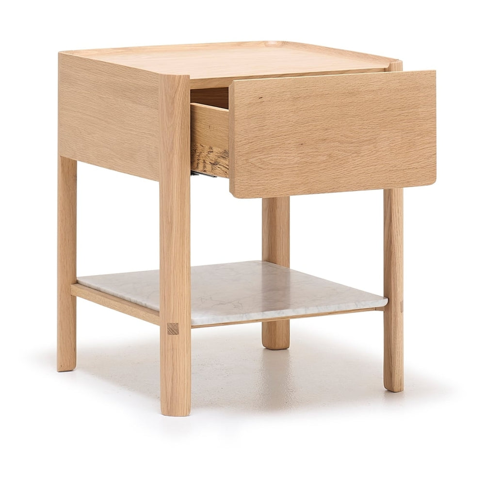 Tye was born from a place of function and minimalism. The bedroom is a place for rest, without need for distractions and ornaments. The rounded legs keeps your shins safe, and the scooped-out top provides a safe shelf for your bedroom essentials while offering a comfortable pull for the draw that stores your personal items. By choosing the marble shelf you add an element of surprise and contrast to your sacred space.